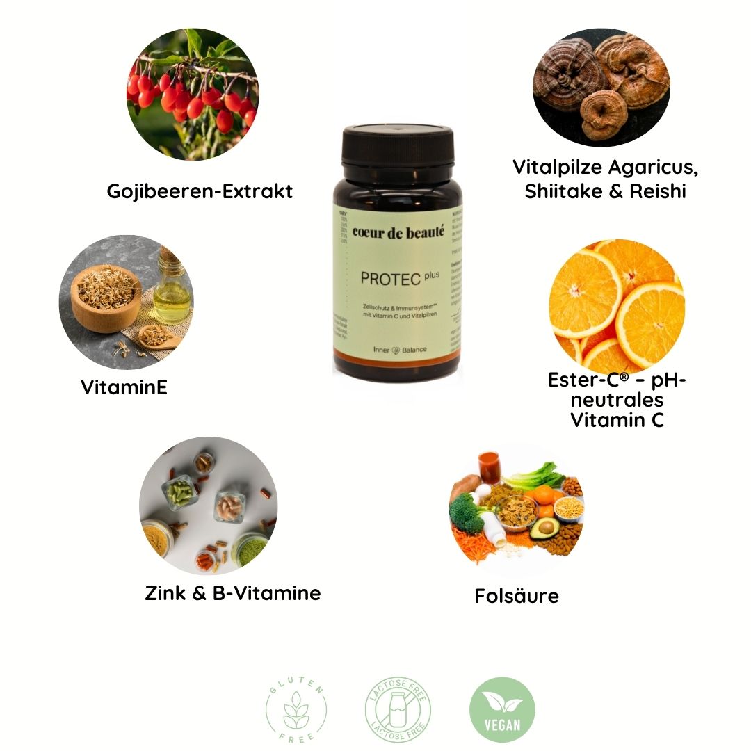 Protectplus wurde speziell entwickelt, um Frauen in diesen Phasen zu begleiten. Die sorgfältig abgestimmte Rezeptur kombiniert hochwertige Vitalpilz-Extrakte, wertvolle Mikronährstoffe und einen standardisierten Extrakt aus der Gojibeere. Vitamin C (Ester-C®), Zink, Vitamin B6 und Folsäure tragen zur normalen Funktion des Immunsystems bei, während Vitamin C, E und Zink zusätzlich zum Zellschutz beitragen – für mehr innere Stärke und Balance, jeden Tag.